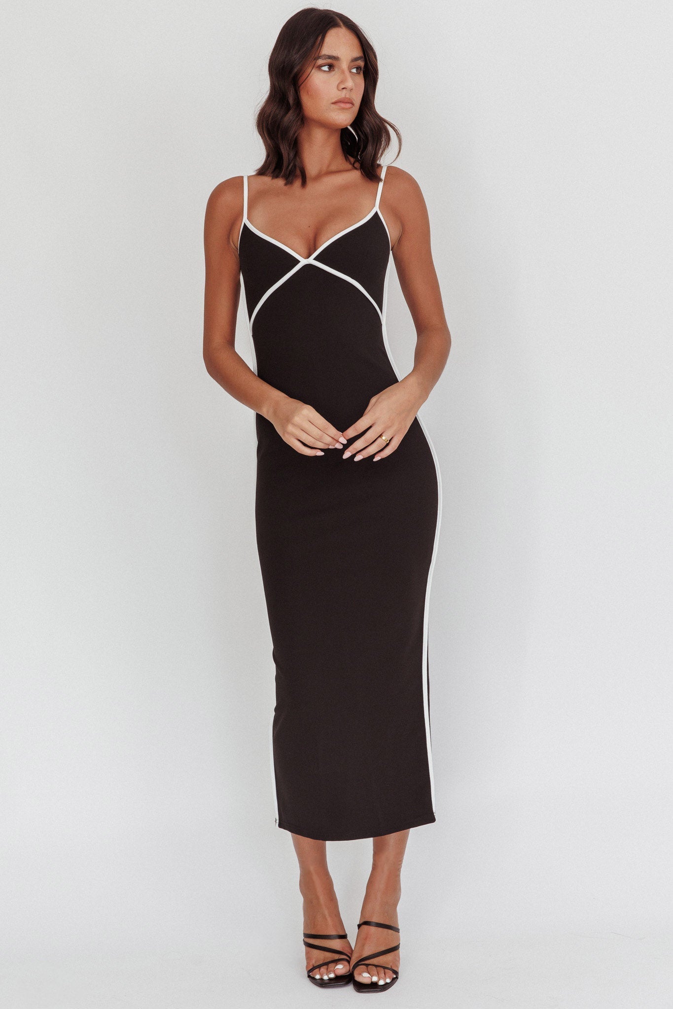 Turn heads in our super hot She's A Mystery maxi dress. It features a contrasting piping trim and deep V-neckline and is just what you need for your next girls' night out! Team it with stiletto heels and a mini purse for a look that will make jaws drop.