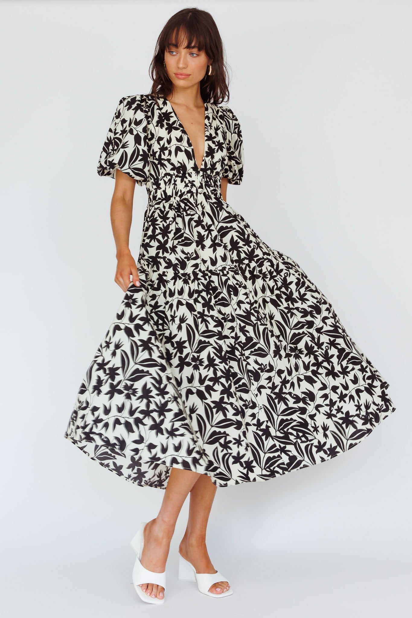 Make an entrance in our pretty Summer Land dress. Perfect for lunch with the girls or a day exploring the vintage flea market, it features a deep V-neckline and gorgeous puff sleeves. Pair it with tan sandals for a super cute look.